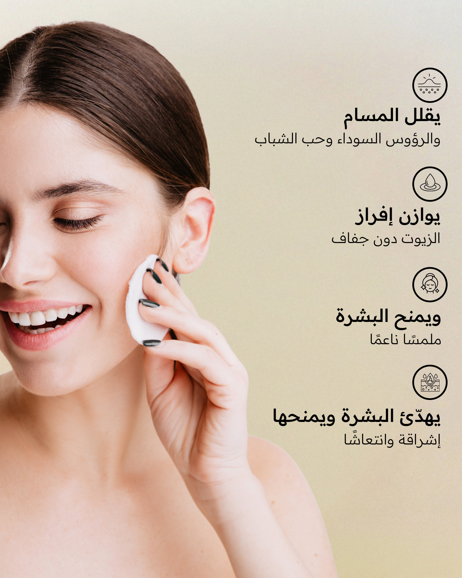 امسحي بها الوجه والرقبة بلطف مع تجنب منطقة العينين.