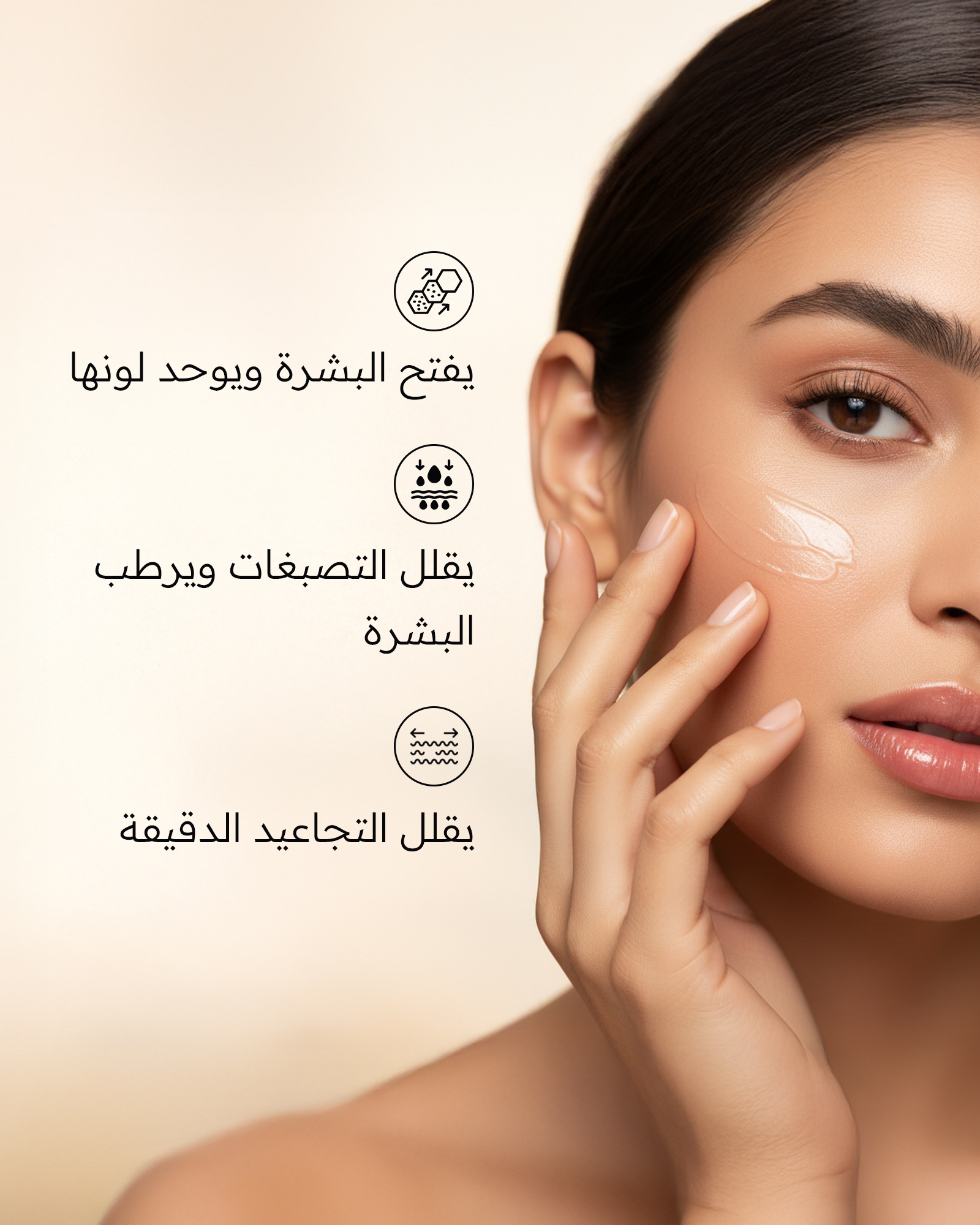 يفتح البشرة، يوحد اللون، يحسن المرونة ويقلل التجاعيد الدقيقة. أكثر استقراراً وألطف من فيتامين سي العادي.